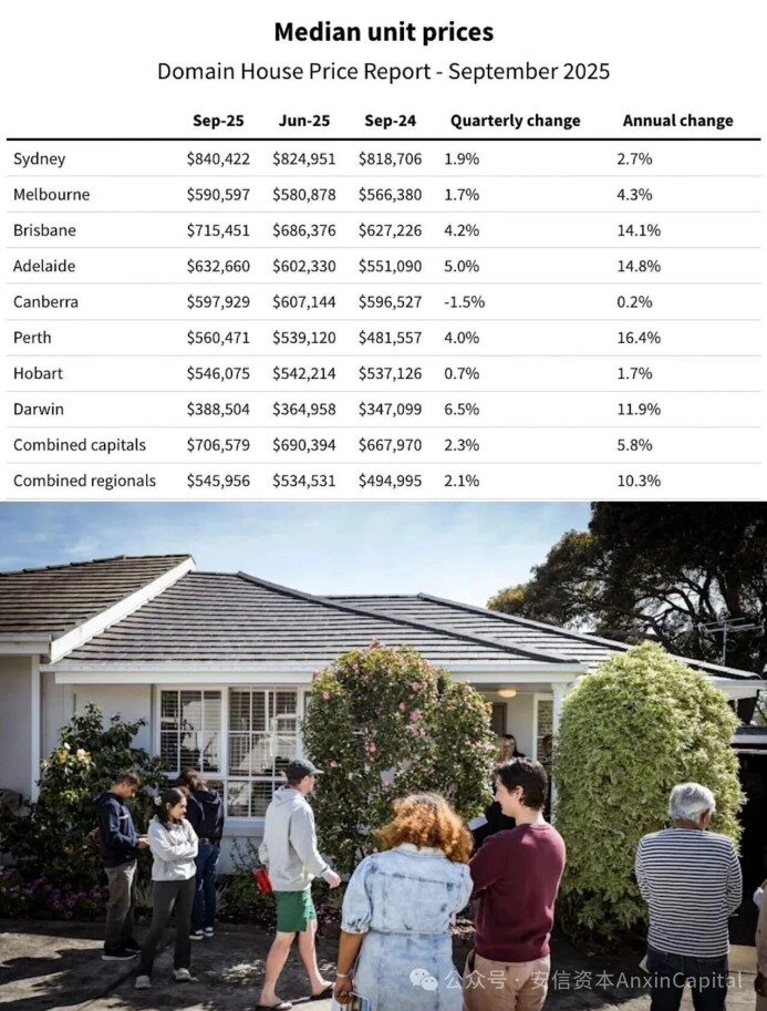 最新數據顯示,澳洲房地產市場正經歷四年來最強勁的成長週期。根據Domain 2025年第三季房價報告,八大首府城市房價齊漲,雪梨獨棟屋中位價突破175萬澳元再創新高,布里斯班更以110萬澳元的中位價首次超越墨爾本,重塑全澳房市格局。同時,上周全澳拍賣量達3448場,創下四年新高,市場熱度持續攀升。